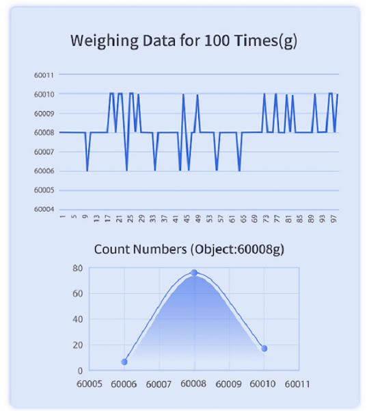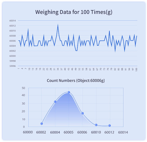Under the guidance of professionals, we began to test CW-60K cyclically. Two test objects with 60008g and 60006g were tested 100 times separately. The weight and error value of each time weighing were recorded. The experimental test data is slightly influenced by uncontrollable factors, such as temperature, humidity, wind speed and wind direction, ground inclination, etc., and the influence of these small factors on the error conforms to the normal distribution. So the weighing results for 100 times also conform to the normal distribution. Therefore, according to the formula, the standard deviation σ is calculated as 1.0g (test object is 60008g) and 1.8g (test object is 60006g), and 3σ is 2.9 g and 5.4g, respectively.