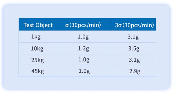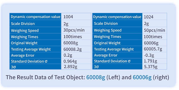Following the same testing and calculation, there is 99.7% possibility that 3σ will be within the range showing on above’s table. In real life, it is often considered to be the impossible event. Therefore, the maximum accuracy of our large-scale checkweigher with 60kg is less than 6g, but the accuracy will also vary depending on the weight of the object, size and other factors.