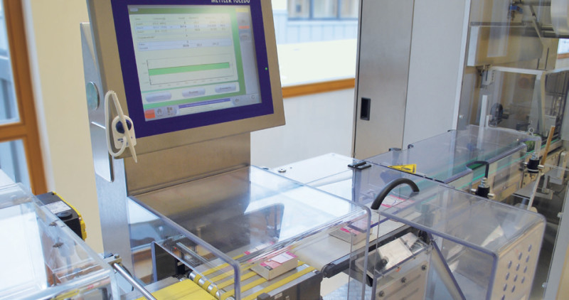 At Acino AG in Miesbach, the checkweigher is equipped with the optional "reject countercheck" feature. This system is used to check whether products to be ejected have really been correctly ejected. If the weigher detects that a "bad product" has not been ejected, the conveyor belt is stopped and an error message is issued to the operators/supervisors, allowing the process to be manually corrected.