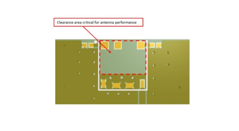 The antenna requires clearance of 7.0 x 5.0 mm on the PCB.