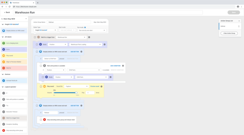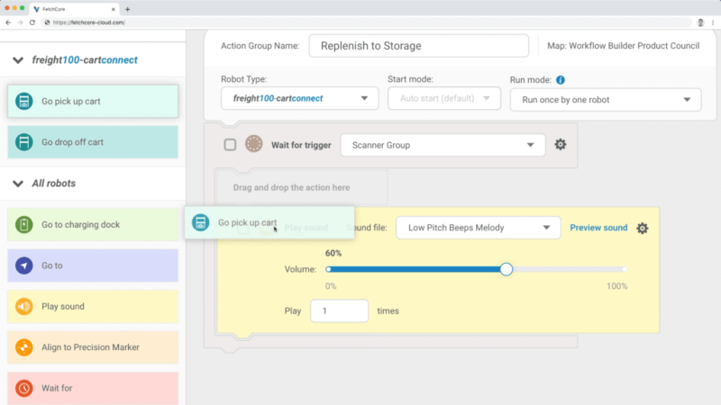 Fetch Robotics, Inc. (United States) - Press Release: After months of extensive customer research to help simplify complex automation workflows in factories, fulfillment centers and distribution centers, today we celebrate the launch of Workflow Builder. Workflow Builder is our new drag and drop development toolkit directly within FetchCore, our cloud-based software platform that enables on demand automation. Workflow Builder lets customers implement automation workflows on-demand without the need for third-party resources. Our team has worked tirelessly with customers to understand challenges in implementing automation workflows that can show value immediately without going having to go through the hassle of WMS integration – integration work is costly, disruptive, and there’s basically no guarantee that the automation workflows will meet ROI expectations. Without an easy way to test workflows until they’re perfect, facilities feel chained by integration and become unable to innovate.
