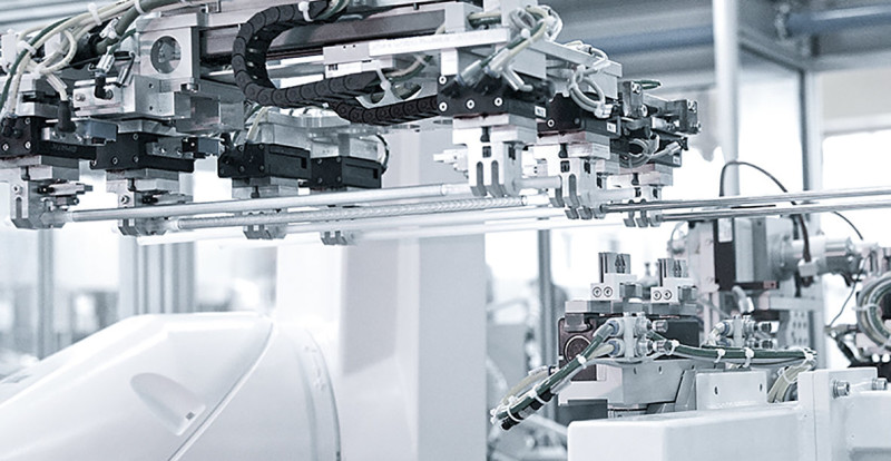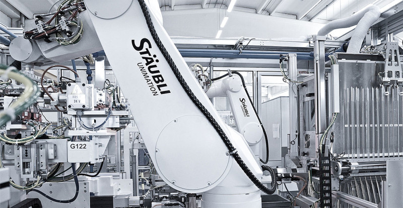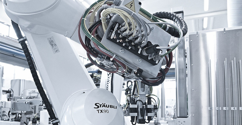 The automated production of four spiral tubes simultaneously is facilitated by the use of two cells in mirror-image layout; Stäubli’s RX160 and a Stäubli TX90 are responsible for the flexible handling. The complicated winding of the spring takes place in an integrated process circuit, which is linked by linear systems. The big advantage of the Stäubli robots is that, even in standard configuration, they already comply with cleanroom class ISO 5, meaning that Elettrosystem did not have to bring in dedicated cleanroom-compatible models.