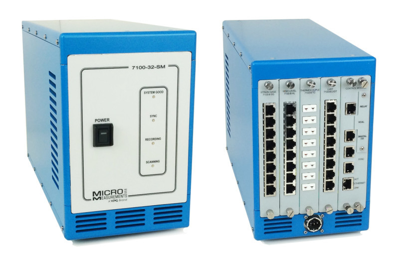 Each of the System 7100’s sensor channel employs a 24-bit analog-to-digital converter and supports synchronized scan rates of up to 2000 updates per second for simultaneous reading of all sensor inputs. The System 7100 can accept signals from strain gages (strain gauges) or strain-gage-based transducers, thermocouples, or high-level voltage sensors. Strain gage channels support full-, half-, or quarter-bridge configurations, and offer built-in precision bridge completion for 120 Ω, 350 Ω, and 1000 Ω.