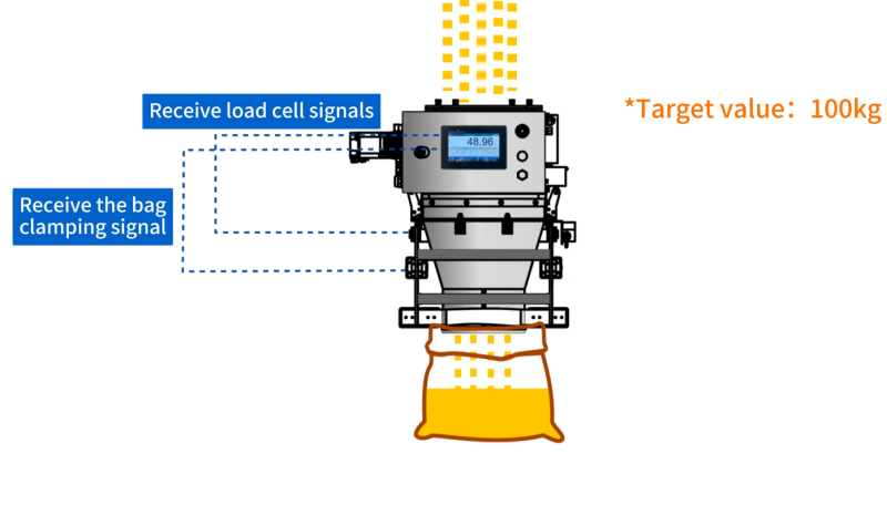 When the target weight is reached, and the weight reading is stabilized, releases the bag. One pack is complete. The system then waits for the next bag-clamping signal to begin the following cycle.