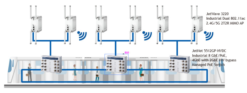 An industrial wireless AP JetWave 3220 is used as an intermediate device for the solution which performs the last mile networking connection. Its dual radio configuration includes 802.11 a/b/g/n/ac and 2.4G/5G bands and new generation 802.11ac MIMO technology. The multi-radio offers a high data rate of up to 866Mbps per radio, providing flexible wireless backbone deployment option and the redundant wireless connections to increase the reliability of the entire wireless network due to its dual radio bridge and redundancy. It not only provides train-to-ground communication, but also offers wireless services on board to passengers. As JetWave 3200 series can be used as wireless access point, network designers could easily achieve the integration of wired and wireless networks.